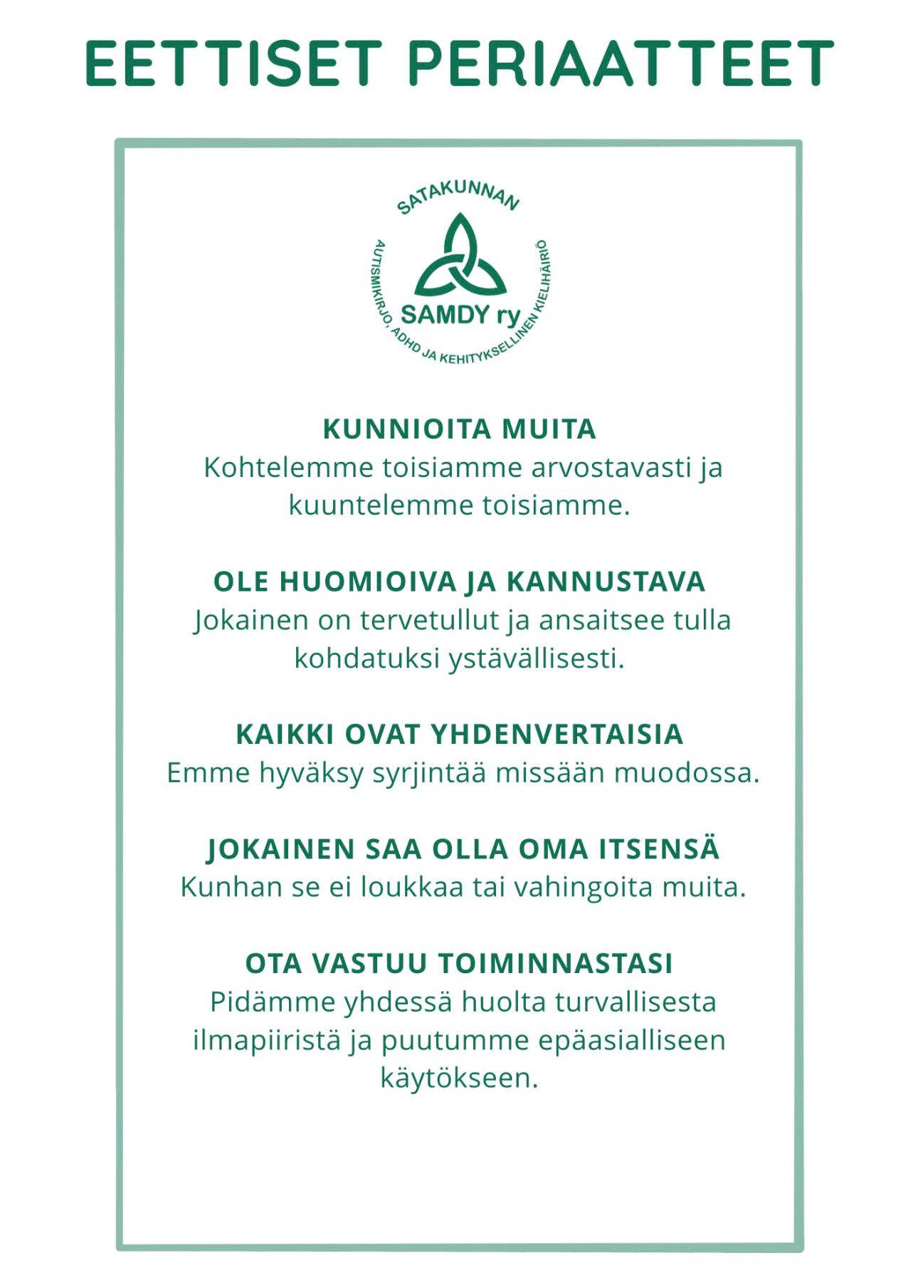 30 vuotta sitten, yhteinen tarve toi meidän perustajajäsenemme yhteen vertaistuessa. Satakunnan SAMDY ry syntyi siitä tarpeesta – tarve, joka edelleen kasvaa Satakunnassa. Tule mukaan toimintaan, jossa voit löytää vertaistukea ja luoda uusia kaverisuhteita.